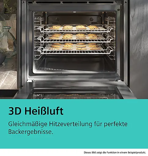 - Backofen mit 8 Beheizungsarten: 3D Heißluft plus, Ober-/Unterhitze, Umluft-Grill-System, Großflächengrill, Pizzastufe, coolStart, Sanftgaren, Heißluft sanft