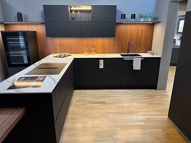 Die harmonische Kombination aus schwarzen Fronten, natürlichem Holz und der satinierten Steinoptik sorgt für ein geschmackvolles und modernes Erscheinungsbild. Die elegant eingebauten Geräte im Hochschrankbereich unterstützen die klare Linienführung und runden das hochwertige Gesamtbild dieser Küche ab.