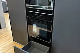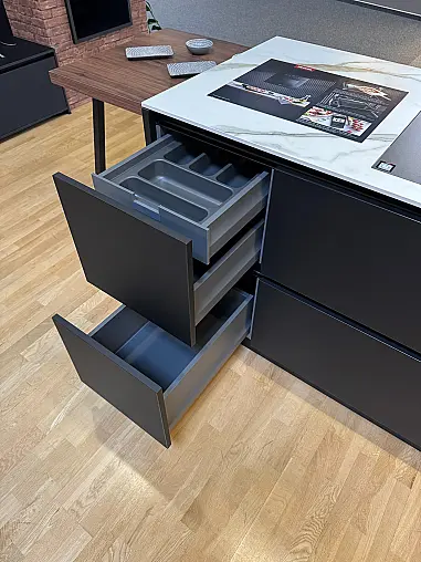 Hier präsentieren wir eine äußerst stilvolle Küche aus dem Hause Häcker in der Ausführung AV2135 Schwarz Matt. Die tiefmatten Fronten verleihen der Küche eine ruhige und zugleich edle Ausstrahlung. Ein besonderer Blickfang ist die Arbeitsplatte in Borghini satiniert, deren feine, sanfte Maserung der Küche eine luxuriöse Note und eine angenehm samtige Haptik verleiht.