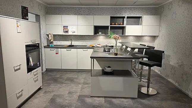 Nobilia Faszination in Seidengrau L-Küche mit angesetzter Insel und Geräte Highboard separat