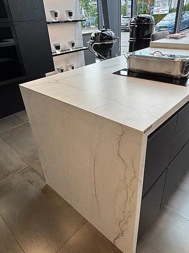 - Große Kücheninsel mit hochwertiger Keramik Arbeitsplatte der Firma Wiebe, spürbare Maserung, fortlaufende Maserung an den Wangen der Insel